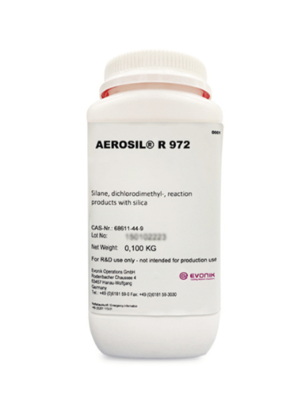 Evonik AEROSILR972 industrial grade hydrophobic fumed silica is a hydrophobic fumed silica treated with DDS (dimethyldichlorosilane). It is highly thixotropic, suspends and stabilizes oily systems, and prevents sagging.