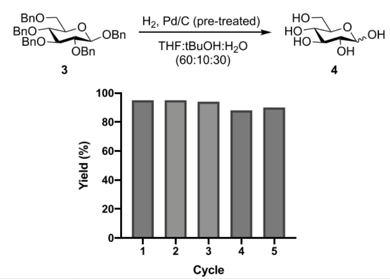 Using fully benzylated glucoside 3 as a model substrate, researchers observed that the Pd/C catalyst—after being recovered via centrifugation—showed no signs of deactivation following five reaction cycles, with yields ranging from 95% to 88%. The coexistence of Pd and PdO persisted, and the small particles remained uniformly dispersed, thereby demonstrating that the catalyst retained its activity even after multiple cycles.