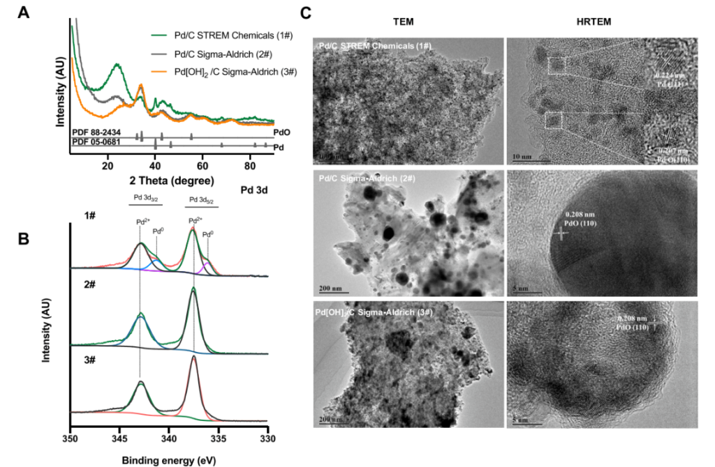 ② Transmission electron microscopy (TEM) analysis revealed that the highly efficient catalyst (5% Pd/C, Strem Chemicals) featured Pd and PdO nanoparticles uniformly dispersed across the carbon support, with an average particle size of approximately 4 nm. In contrast, the lower-quality catalysts exhibited severe particle aggregation and a non-uniform size distribution—characteristics detrimental to the catalytic process.